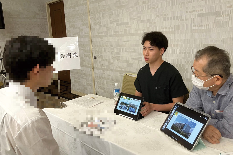 今回は1年次研修医の明石先生が初めてプレゼンターとして説明会に参加して頂きました。最初は、かなり緊張気味でしたが、中川総長のフォローを貰いながら徐々に緊張がほぐれてきました。後半からは、力強く、ご自身が内科研修中に学んだ手技や当院の自由度が高く、自分の興味のある分野を積極的に学べる環境であると訴求して頂きました。