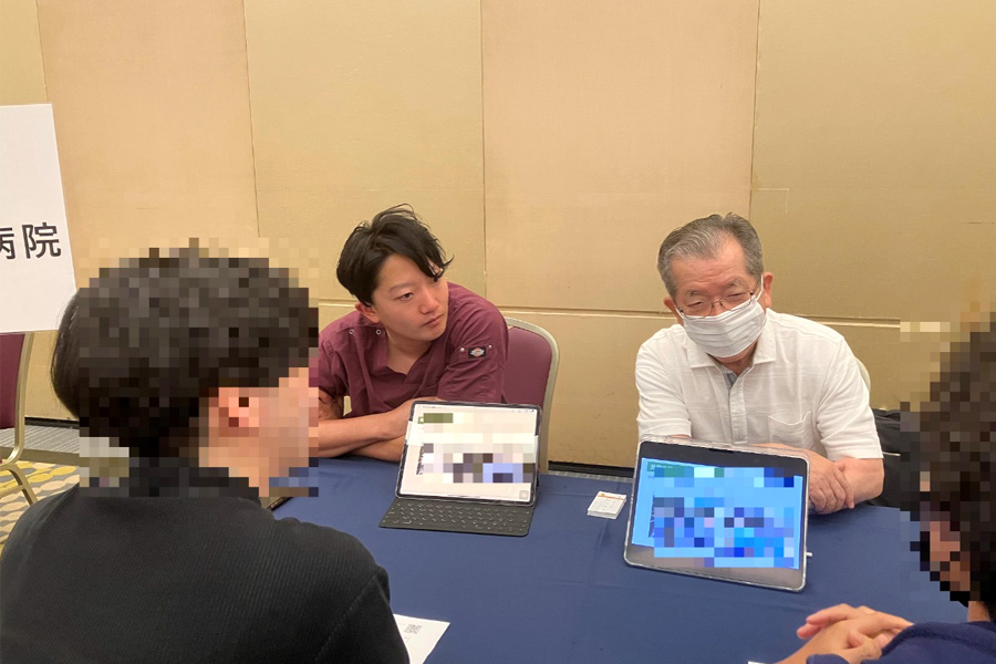 個別プレゼンでは、ご自身が外科研修で経験したことを、自然体で学生さんにお話しされ、学生さんたちに親しみやすくプレゼンをしているのが印象的でした。中川総長からは、健康な身体は良き研修を導くとの思いを持って日々指導に取り組んでいる点を訴求して頂きました。当院のブースには6名と多くの学生さんが参加頂きました。