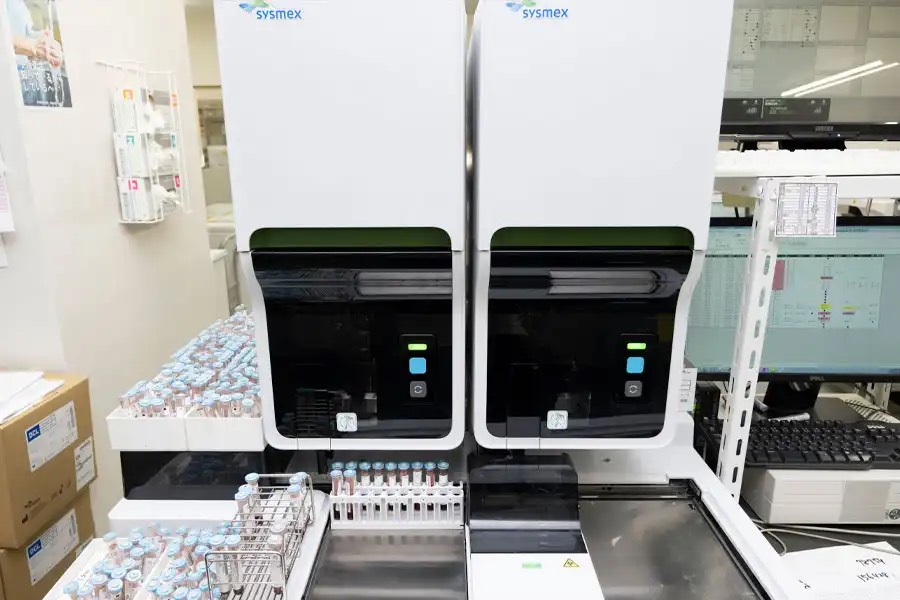シスメックス社のXN-2000という測定機で、血液中の白血球数、赤血球数、血小板数、ヘモグロビンなどを測定し貧血や炎症がないかなどを調べます。 また、アークレー社のGA-1170という測定機で、血糖値を、HA-8170という測定機で、HbA1cを測定しています。