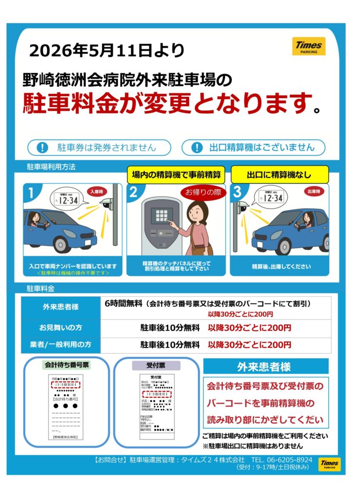 お知らせ 2026.04.16駐車料金変更のお知らせ Line note 記事のタイトルとURLをコピーする2026年5月11日より野崎徳洲会病院外来駐⾞場の駐⾞料⾦が変更となります。下記をご確認ください。 GW 一部診療科の診療実施のお知らせ前の記事